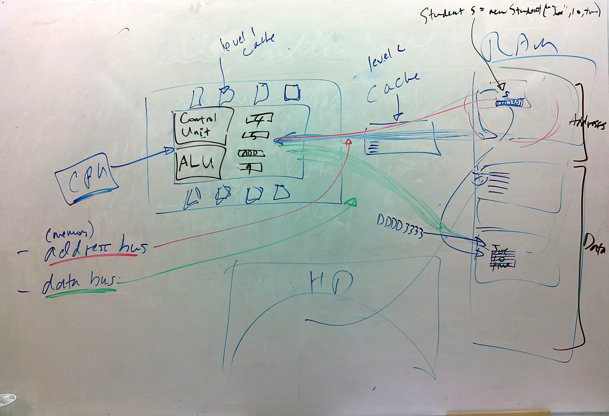 First, from the teaching notes, do note that - uncharacteristically for this syllabus - you are expected to reproduce an actual diagram. And remember that the diagram in the textbook is not quite correct in that the ALU and the Control Unit are the parts that are within the CPU itself, not all the other things under the "Primary Memory" section. Though note that often times there is some cache in the CPU itself - this is called Level 1 cache. Meantime most cache of it is not built into the CPU, yet is close by - this is called Level 2 cache.
