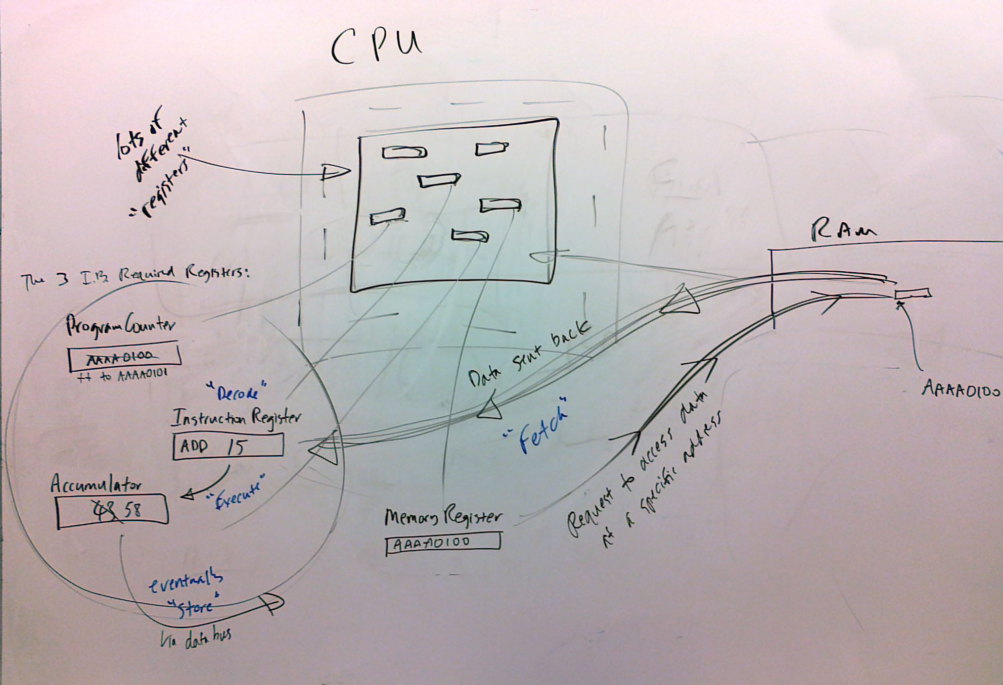 Remember here that the one crucial register missing is the Memory Address Register - the textbook does a good job of covering it. And do note that these are not all of the registers. Refer back to my Topic 3 notes where the CPU is discussed to get an idea of other registers. A certain processor might have 64 or 128 or 256 different registers, but these are the main ones to get your head around. So here's a summary of what each of the three registers mentioned in the syllabus do:
