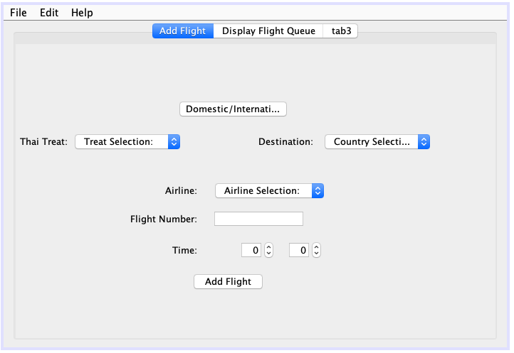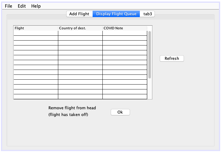 | Entry of new flight to the flight queue. | Enter various possible data. Upon press of the Add Flight button, the visible result is And internally, the flight is added to the back of the queue |