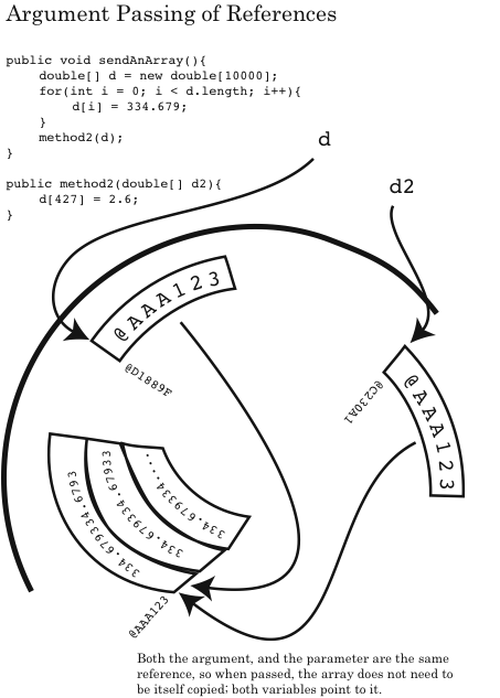 But, the main thing to note is that when something was changed in the array in method2, that change was made to the array pointed to from method1, because they are the same array, even though pointed to by two different copies of the same reference. See the diagram.