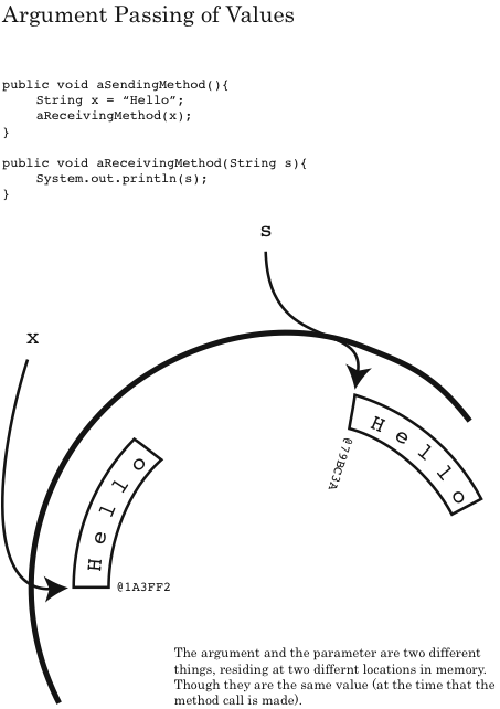 Why would we want the choice of whether a parameter is value or reference? Well, there are times where you might want the original value passed to change as it’s “sister” parameter changes, and there other times where you want them to remain independent of each other. But the developers of Java kept things simple; primitives are sent as value, and objects are sent as reference. (In terms of what an object is, for now, let’s just keep it as anything made with the new operator.)