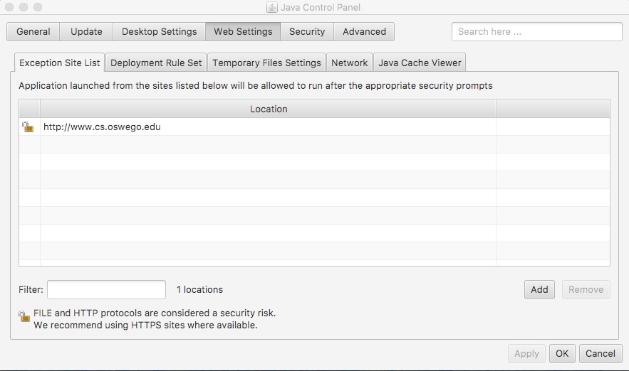 BUT you will need to allow the Java application to run. Go to System Preferences, click Java, and then, refering to this image, go Web Settings, Add, Add, Ok (Mac OS Sierra). Then relaunch your browser, and Ok the Java warnings that come up.