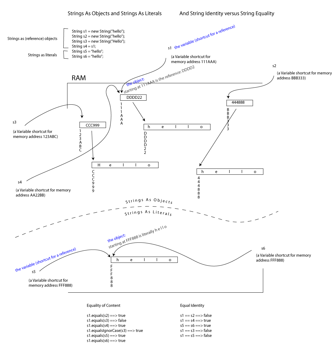 When working with Strings it is imporant to keep in mind the difference between equality and identiy, and the usage of the .equals( ) method, vs. the == operator. The two Strings have "equality", when what they are representing are the same word/s. But their "identity" refers to specifically where they are in memory. So two Strings could have equal equality, but not have equal identiy. See the diagram below, but here's a simple example: