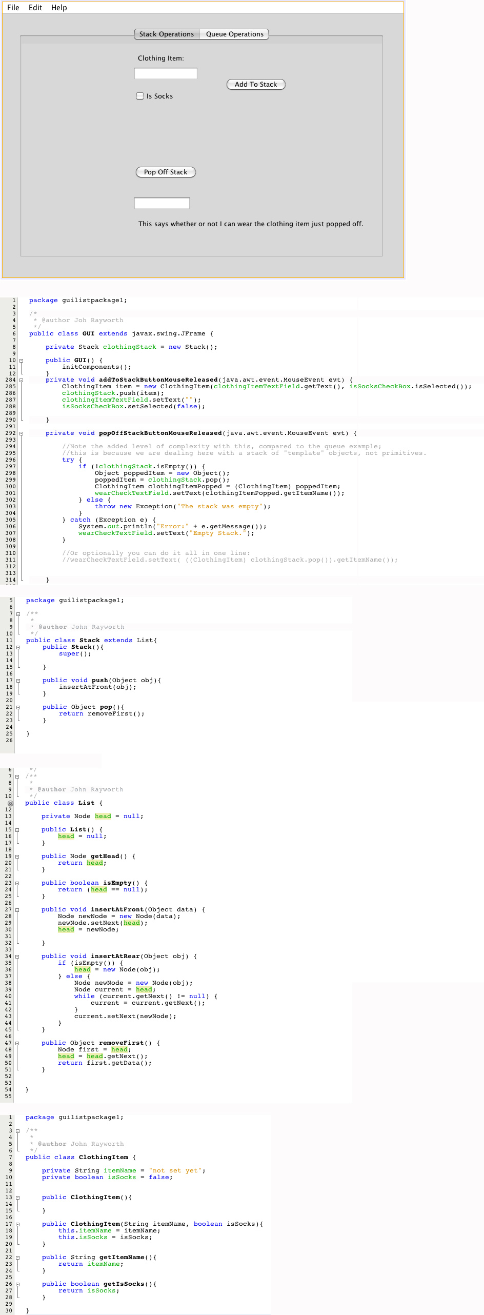 And also note that in terms of OOP and inheritance, this does not require you to extend List class to a Stack class and a Queue class, but that that is actually really easy to do: for a Stack class, push just calls addLast, and pop calls removeLast - and with Queue extending List, enqueue just calls addFirst, and dequeue calls removeFirst.