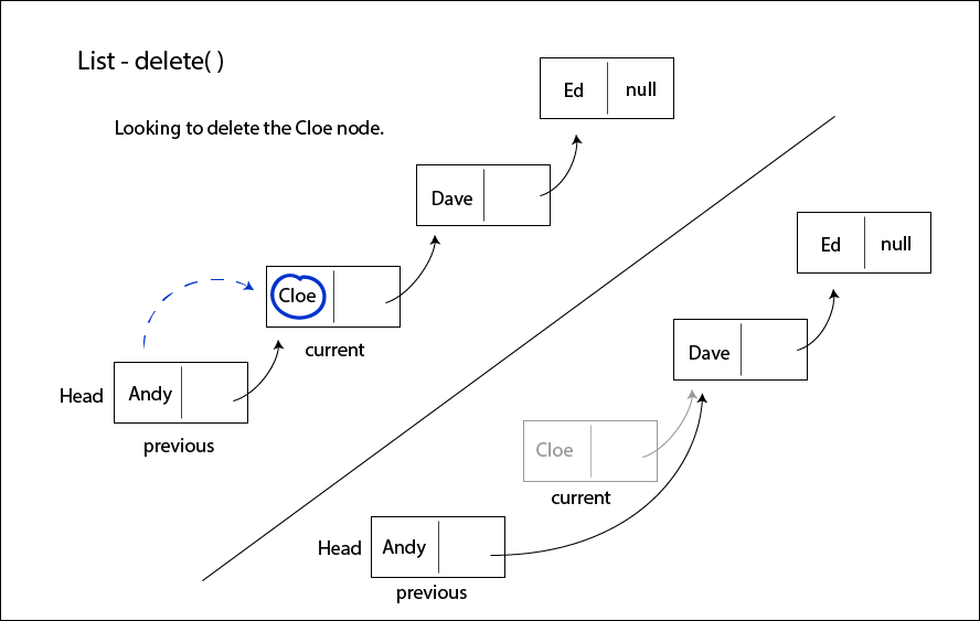 public void delete(Object data){ 77 Node current = head; 78 Node previous = null; 79 if(head.getData().toString().equals(data.toString())){ 80 head = head.getNext(); 81 } 82 while(current.getNext() != null){ 83 previous = current; 84 current = current.getNext(); 85 if(current.getData().toString().equals(data.toString())){ 86 previous.setNext(current.getNext()); 87 break; 88 } 89 } 90 }