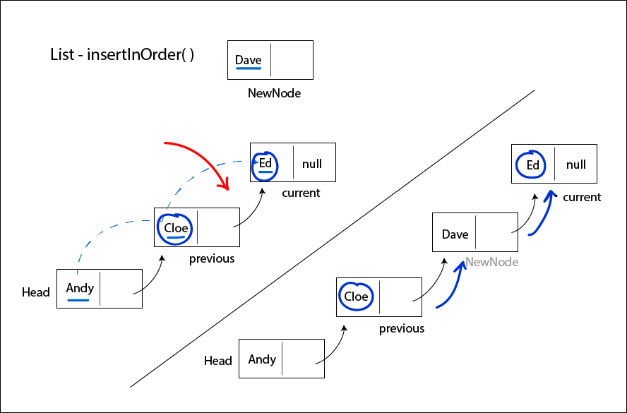 60 public void insertInOrder(Object data){ 61 Node newNode = new Node(data); 62 Node current = head; 63 Node previous = null; 64 if(data.toString().compareTo(head.toString()) < 0){ 66 newNode.setNext(head) 66 head = newNode; 67 }else{ 68 while(newNode.getData().toString().compareTo(current.getData().toString()) > 0 69 && current.getNext() != null){ 70 previous = current; 71 current = current.getNext(); 72 } 73 previous.setNext(newNode); 74 newNode.setNext(current); 75 } 76 }