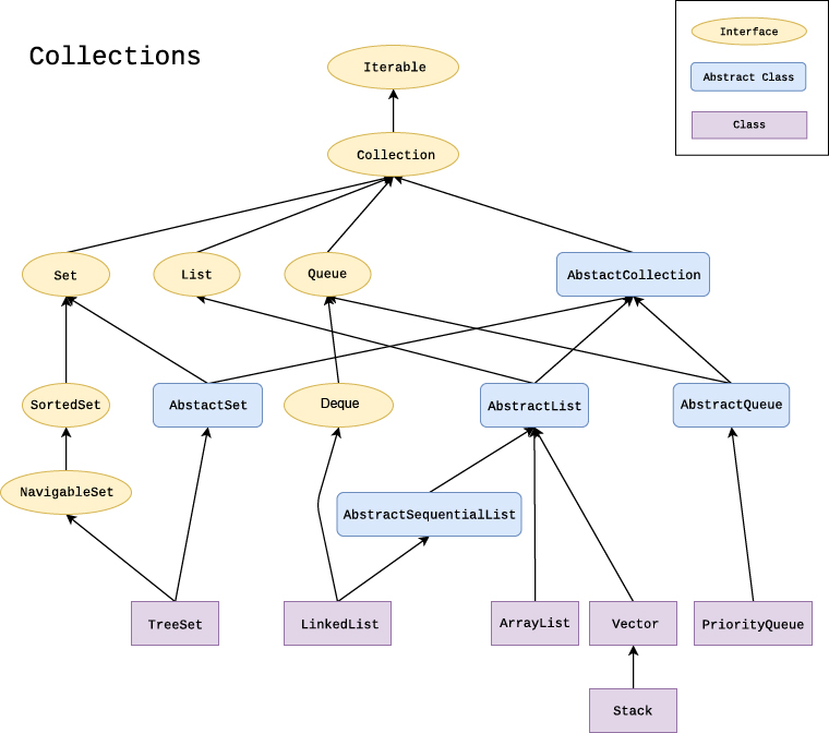 The only things we actually use, as programmers, in a given framework are the classes at the bottom of the hierarchy; and of the six of them in Java the Collections framework, there are two library collections that we are to be familiar with for IB CS; they are LinkedList and ArrayList. (By the way, interfaces give an list of methods that must be included by classes which implement them, and abstract classes have actual methods and attributes, from which you can extend classes, but they themselves cannot be instantiated - so both "simply" inform how classes below them in a given hierarchy will be implemented.)