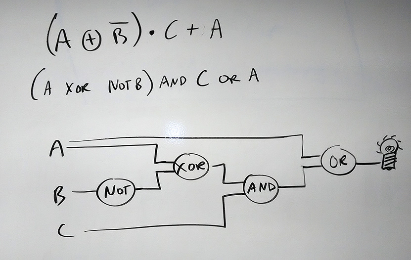 Firstly, going back to the Teaching Note; it says "Problems will be limited to an output dependent on no more than three inputs." But here's the beauty, if you want to build a computer from scratch, that's all you need! Because if you can work with three inputs, that's the maximum of what is necessary to add two binary digits together! The one digit (that can be 1 or 0), the second digit (which can be 1 or 0), and the carry digit (which can be 1 or 0). Three! That's it!