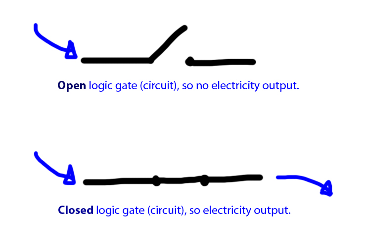 "Open" circuit = incomplete, electricity does not flow through - represented by boolean 0.
