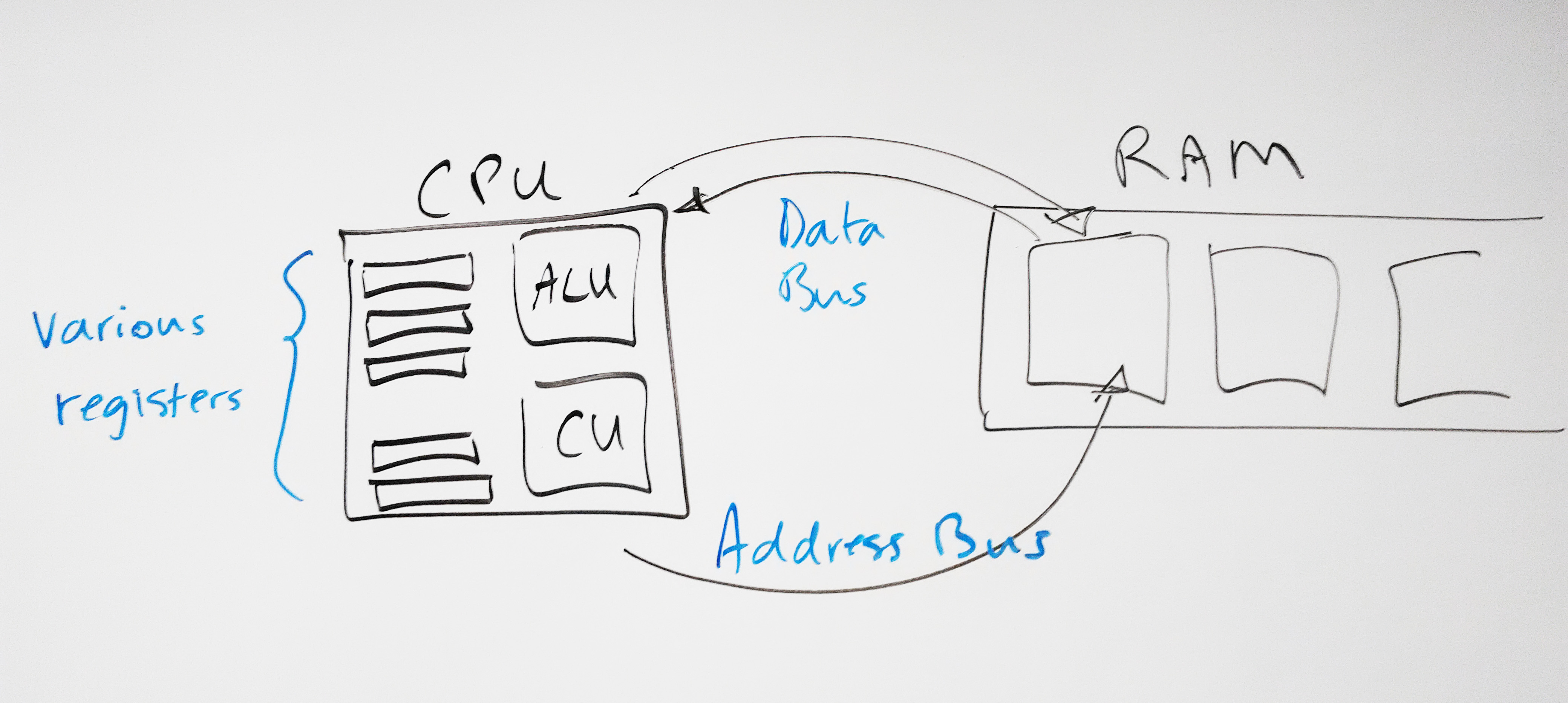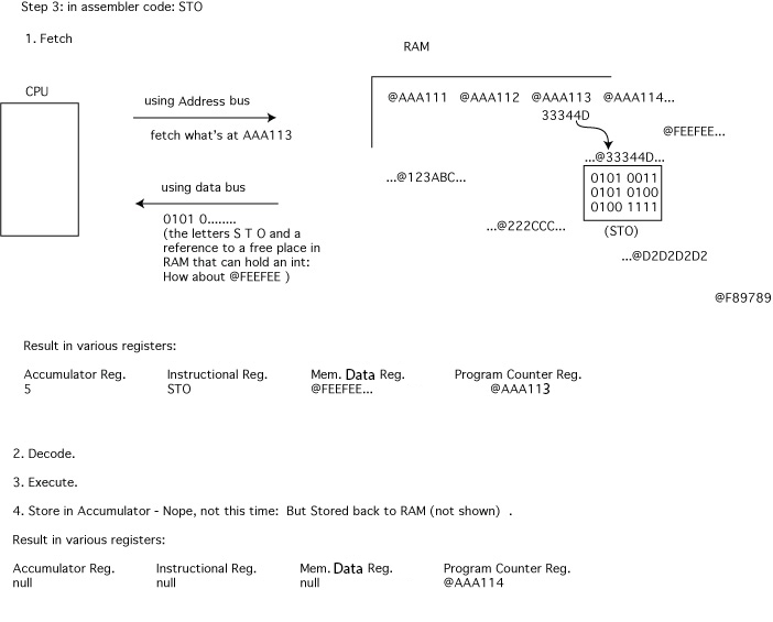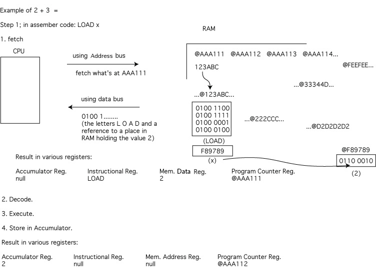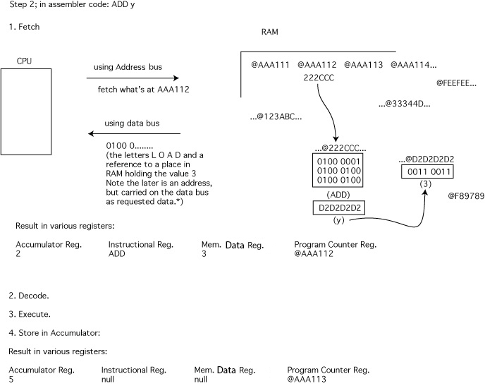 - fetch (from the RAM, found via the address bus, brought back via the data bus)