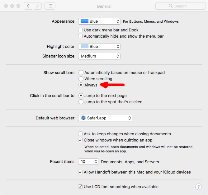 Here's another example of one of many user preferences that clearly the OS is in control of. You can make it so that the scrollbar of windows (of all applications) always shows. In this case, we know it's the OS in control, as the setting is changed in the General System Preferences of the Mac OS, yet it is applied to all applications.
