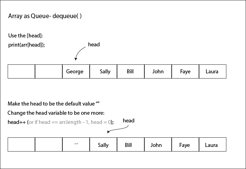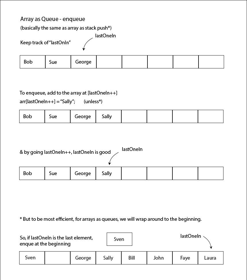 And do note that array-as-queue dequeue algorithm seen in the video would not be very efficient for large arrays, since every time an item is dequeued, all other items need to be shifted down. The much more processing efficient way is to take the approach in the the diagrams above.