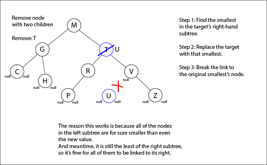 (And one other point is that it also works to move the largest of its left sub-tree to replace the target node.)